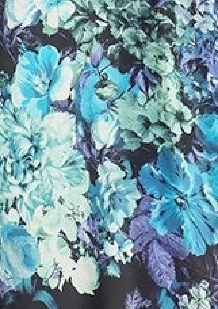 Floral print 52″ Kimono with solid colour trim to the neckline, cuffs and belt.
