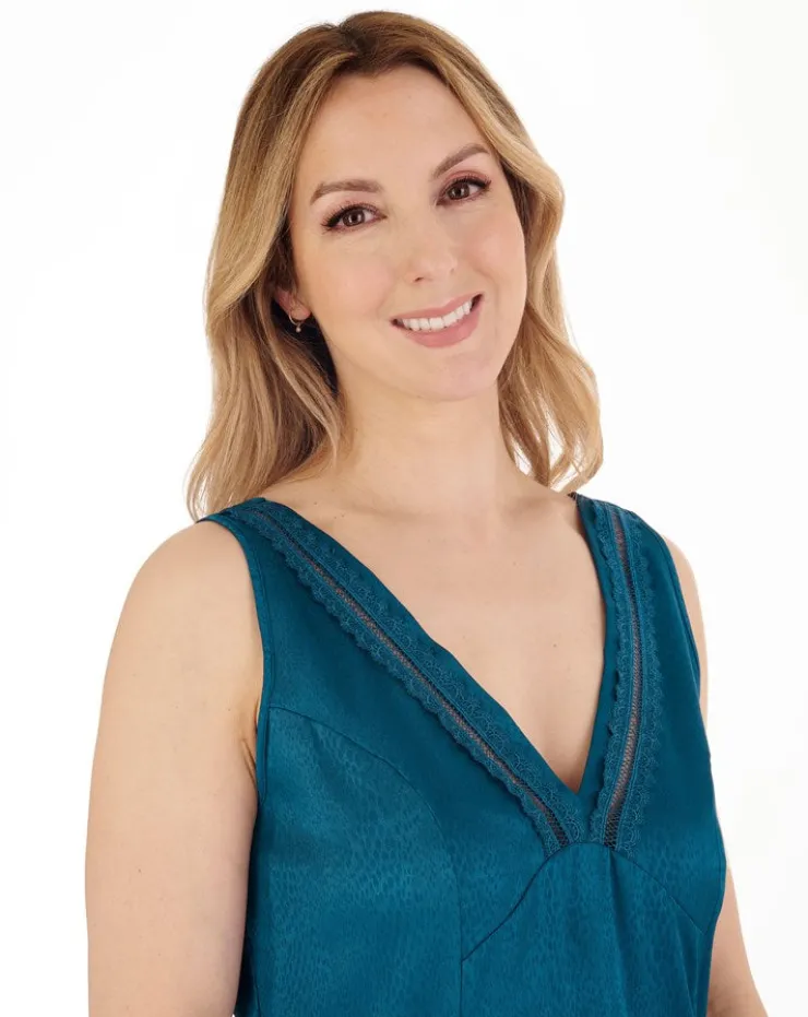 An elegant jacquard statin long nightdress designed in a solid colour with a delicate matching animal inspired print throughout, complete with a built-up shoulder and finished with a detailed Guipure lace to the V-neck. Why not style with our matching kimono wrap for a complete look, see GL88724 for kimono.