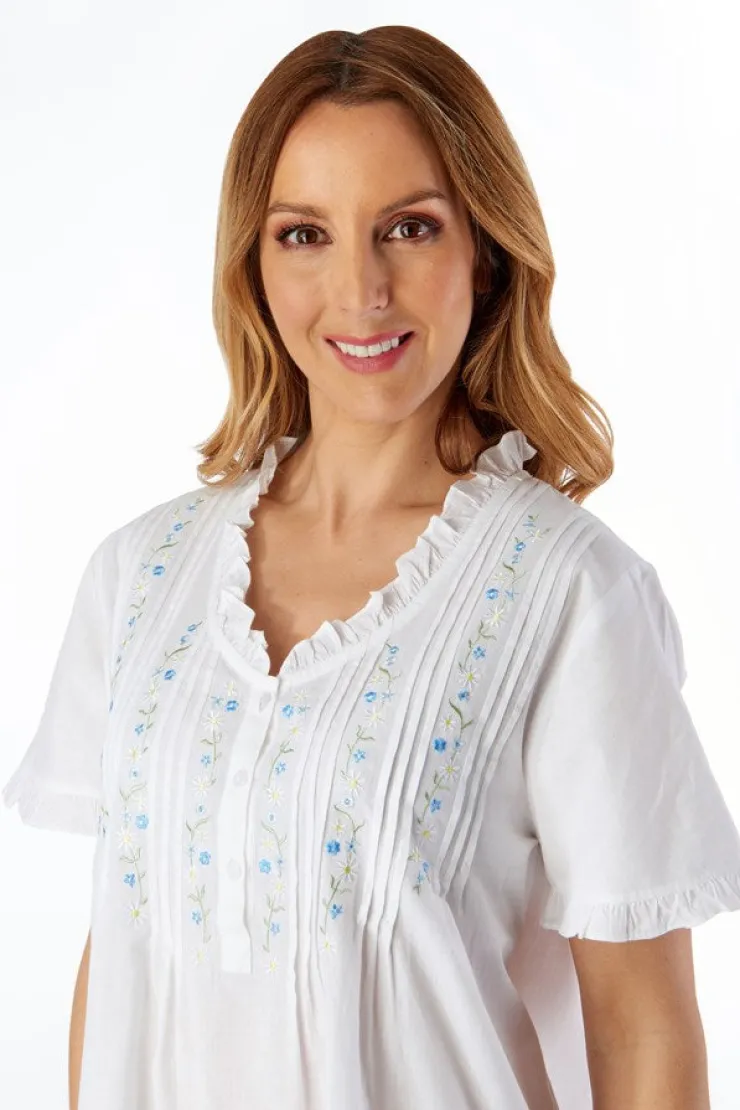 An elegant style nightdress measuring 42” in length is designed in a short sleeve style for comfort. Designed with pintuck detail to the front and coloured floral embroidery to the yoke, this feminine style is ideal for the warmer weather. The garment is styled with a ruffle trim to neck and armhole, finished with a classic 3 button finishto allow ease with dressing.