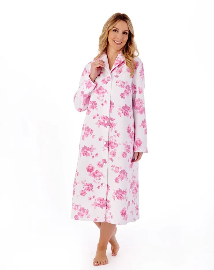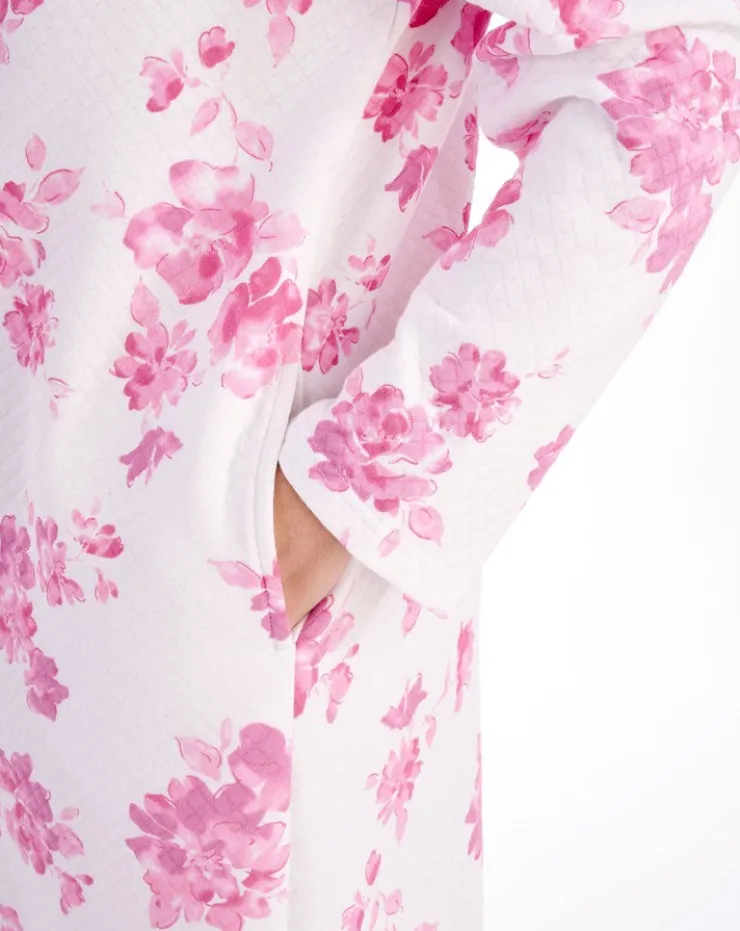 A beautiful bold floral mock quilt housecoat styled with a small shawl collar, pearlescent buttons and finished with two concealed side pockets. This housecoat is ideal to pair with most of our nightwear range. A modern twist to a classic look.