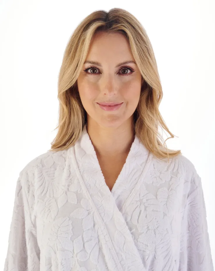 Made with a luxurious, soft blend of Polyester and Cotton, this 38″ length kimono wrap style features a beautiful raised floral design, adding a feminine touch to a modern towelling robe. Designed with long sleeves for comfort, it is perfect to wear post wash or simply wear over our co-ordinating nightwear. The satin piping trim adds a touch of sophistication, while the 2 concealed pockets provide convenience. Complete with a matching waist belt.