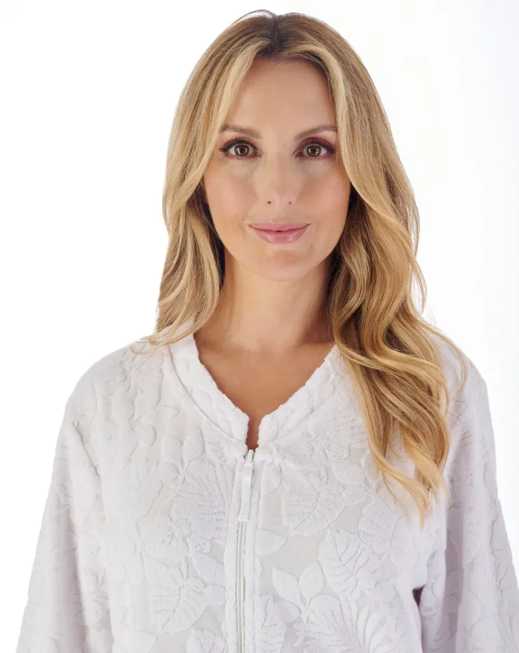 Made with a luxurious, soft blend of Polyester and Cotton, this 42″ length housecoat features a beautiful raised floral design, adding a feminine touch to a modern towelling robe. Designed with 3/4 sleeves for comfort and a zip fasten style, it is perfect to wear post wash or simply wear over our co-ordinating nightwear. The satin piping trim adds a touch of sophistication, while the 2 concealed pockets provide convenience. Complete with a matching waist belt.