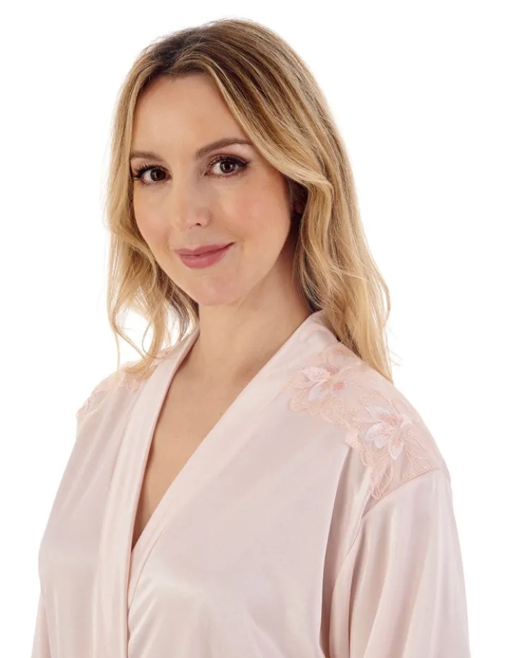 Designed in a classic style, this soft and durable 100% polyester wrap features a knitted satin fabric, providing a luxurious and comfortable feel. The delicate floral embroidered trim on the shoulder adds a touch of elegance to this 46″ length, 3/4 sleeved nightdress.