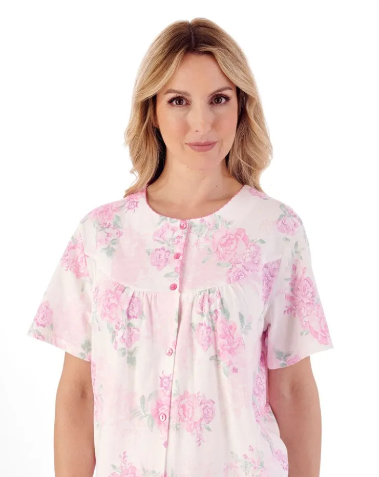 This classic jersey pyjama set has an all-over floral print over a solid colour base, finished with a picot trim to the round neck and placket seam. Complete with a round yoke and a 6-button opening to allow ease with dressing. The pink comes with an ivory base and pink flower and the blue is a pale blue base with a deeper blue flower.