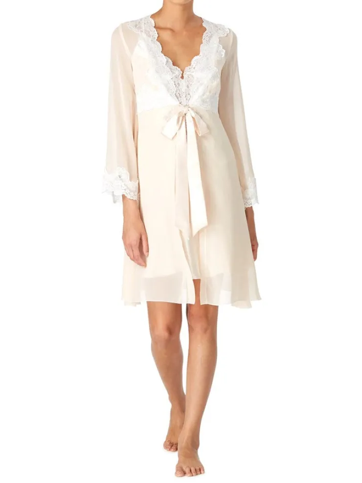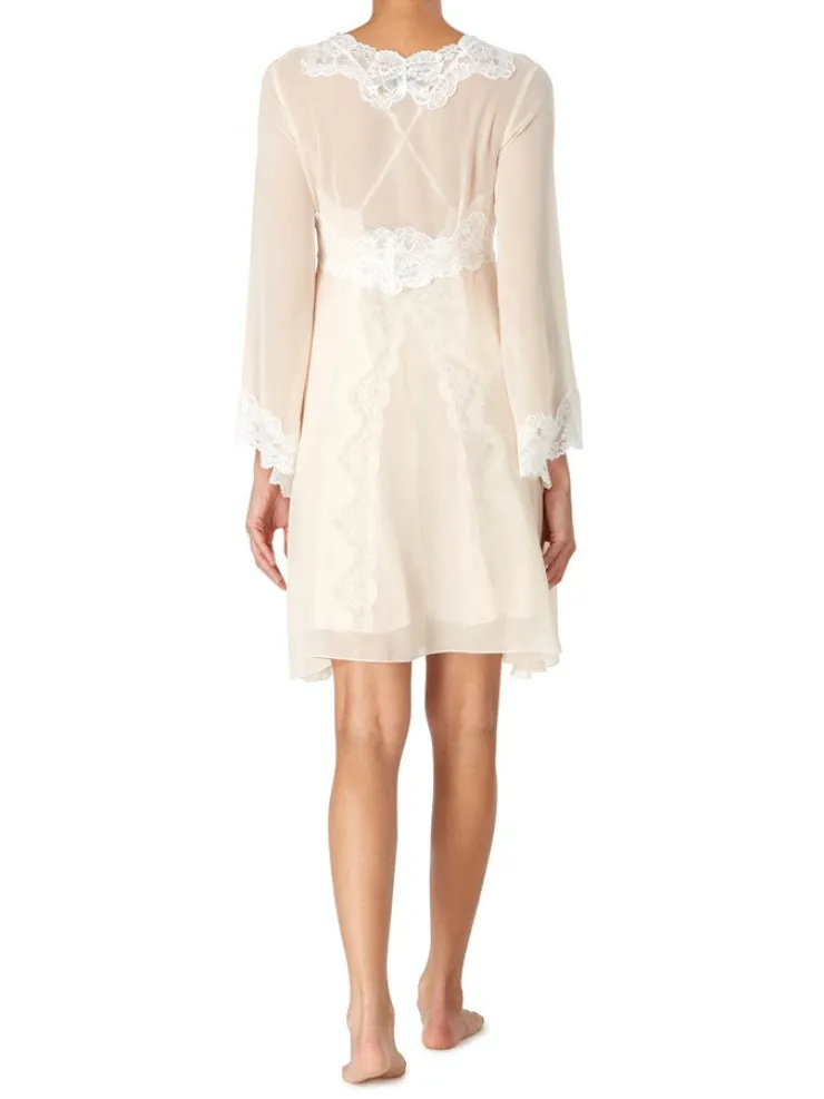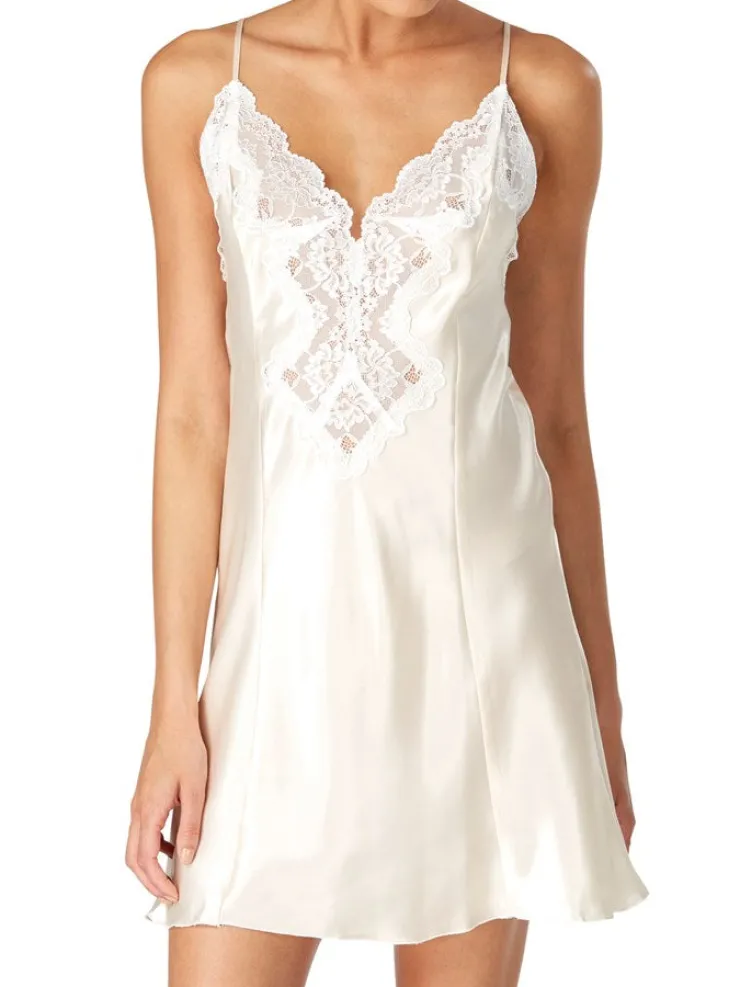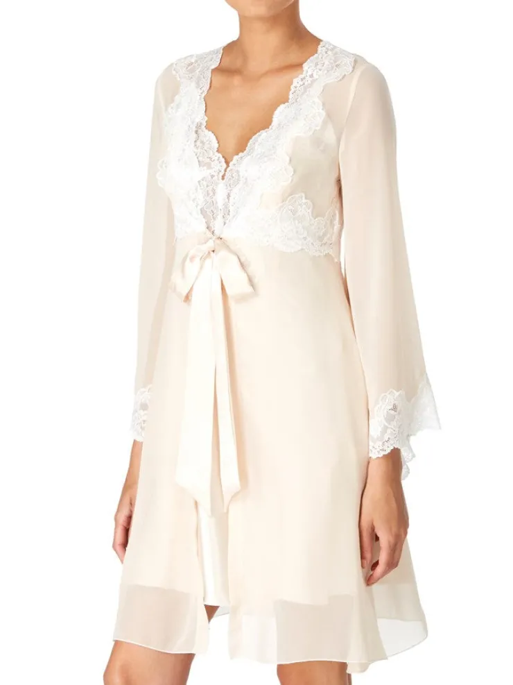 Feel glamourous in our Gaspé 36” length spaghetti strap chemise and wrap set. Complete with a detailed deep lace to bust and back area for a fun and expressive evening wear.The chiffon wrap has a subtle satin tie detail to front and lace detailing to the cuff. Limited stock left.