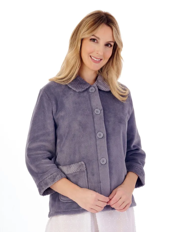 Wrap yourself in timeless style with our 3/4 Sleeve Mini Waffle Fleece Bedjacket. Crafted from soft and warm 100% polyester, with a peter pan style collar, large patch front pocket with waffle detailing, this bedjacket will be a luxurious companion on cooler days thanks to the coral fleece fabric. It’s perfect for elevating your autumn and winter wardrobe.