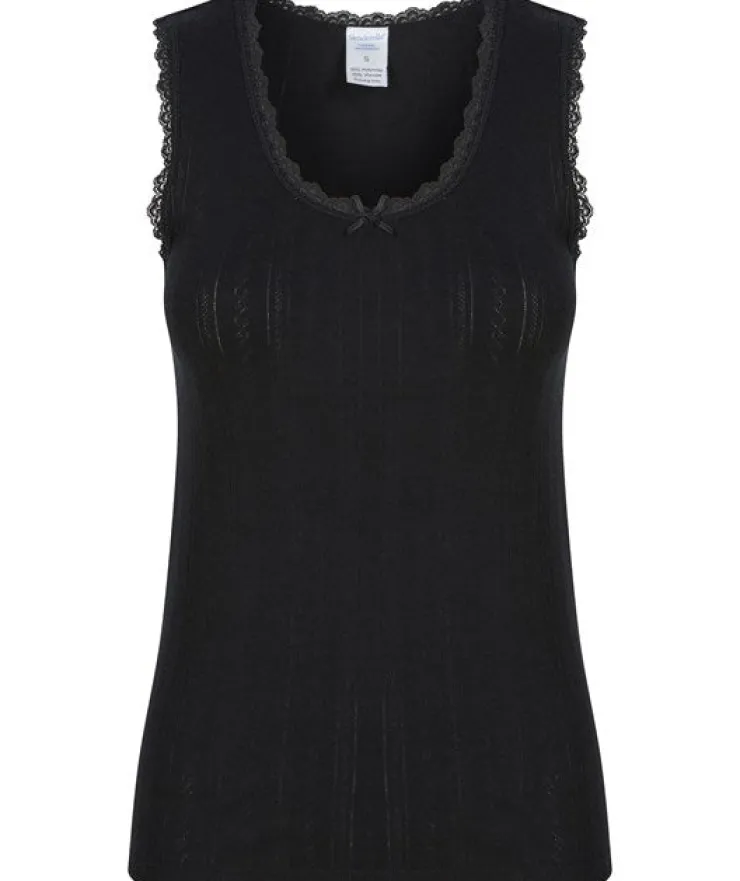 A classic styled top designed in a brushed thermal fabric for warmth and comfort, ideal to wear under clothing in the colder seasons. Designed in a sleeveless style and in a seam free design, this garment is ideal for everyday wear providing a comfortable fit. With knitted soft fibres in the fabric, it creates an extremely flexible and durable garment. Designed with a delicate pattern all over, the style is finished with fine lace edging to neck and straps with pretty bow to centre of neckline.