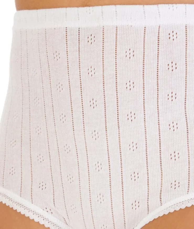 A classic styled brief designed with elasticated waist for comfort and fit, ideal to wear under clothing all year round. Designed in a delicate pointelle knit pattern, the garment is finished with lace edging to leg holes.