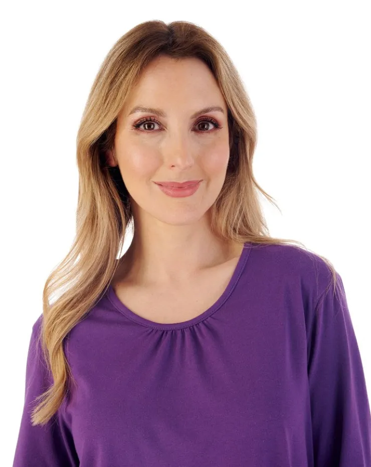Our popular pyjama set is designed in an all-over classic check woven trouser and a solid colour jersey top. Detailed with gathers to the centre front neck and an elasticated waist long trouser. This woven and jersey fabric will keep you warm throughout the cooler months ahead with maximum comfort.