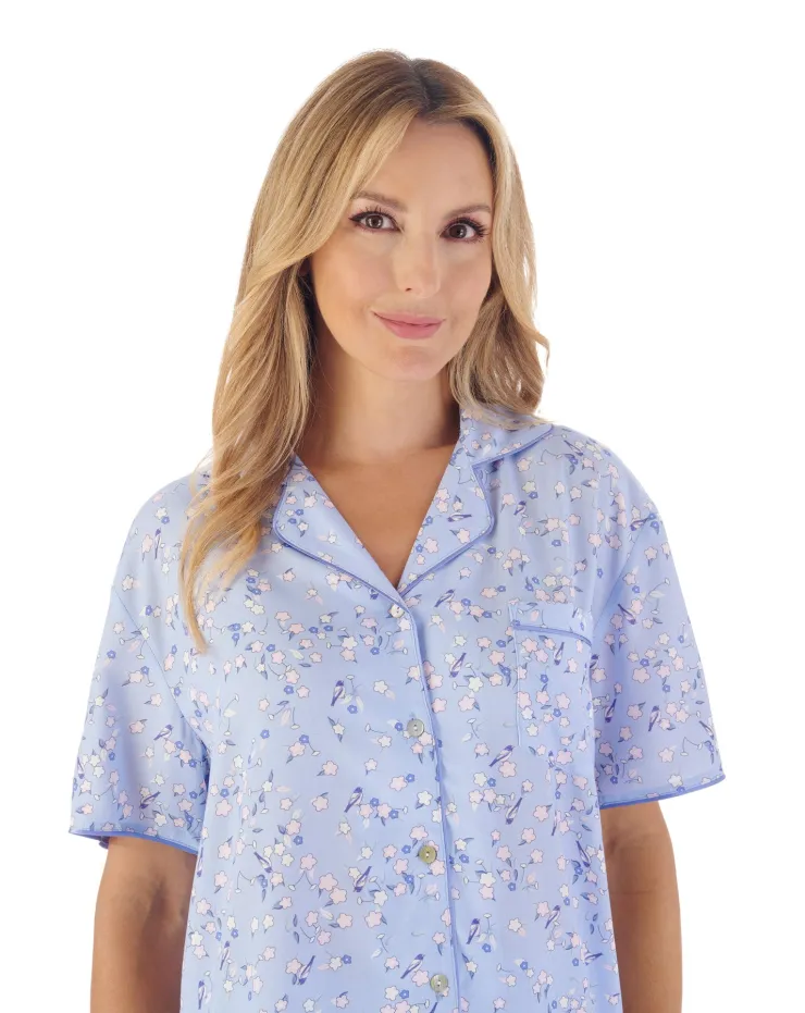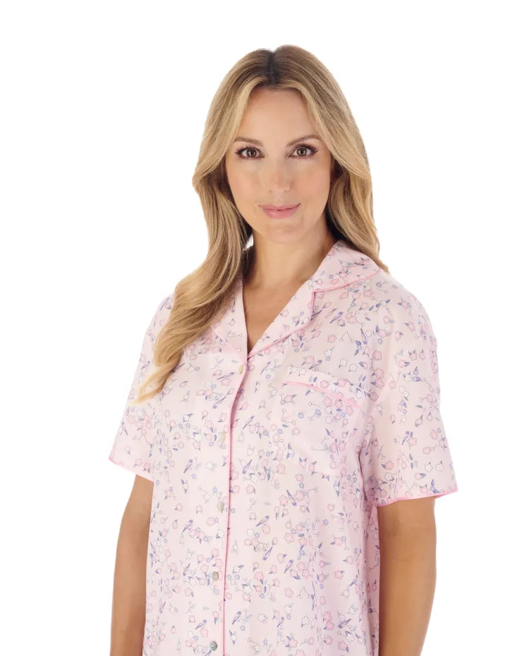 A beautiful short sleeve tailored style pyjamadesigned in an all over pale colour with a delicate blossom and bird print throughout. Completewith a5-button front opening and an elasticated waist for ease with dressing. Finished with a satin piping to the leg hem, collar, centre front and pocket top, the soft viscose fabric gives a nice drape to the garment. Perfect for the warmer nights.