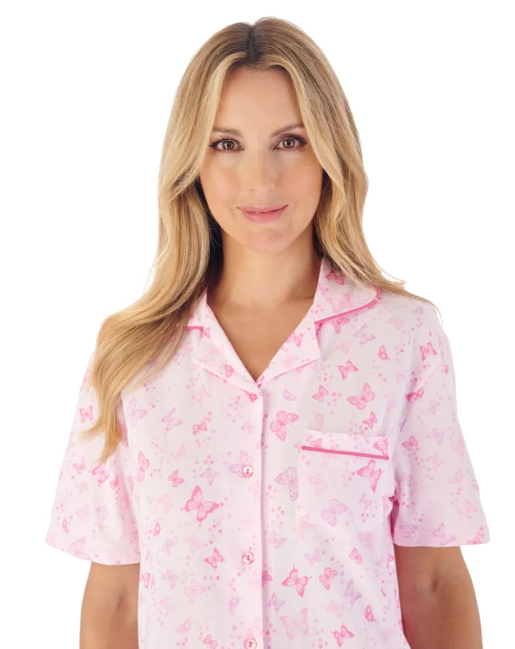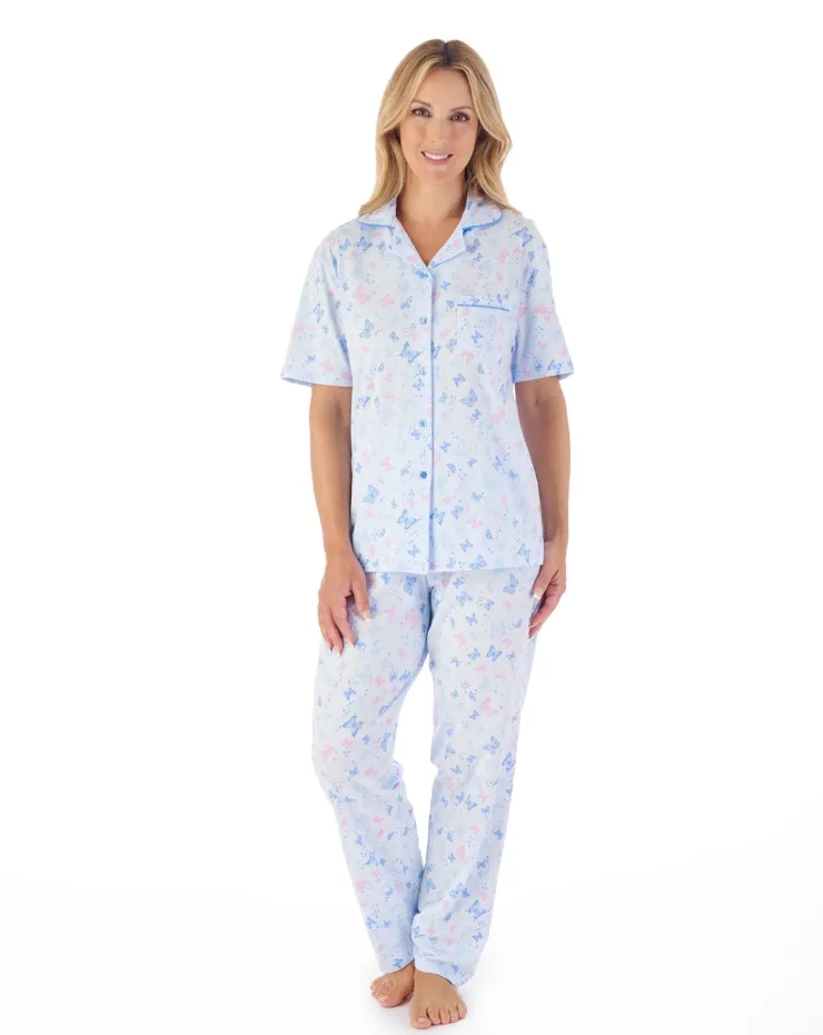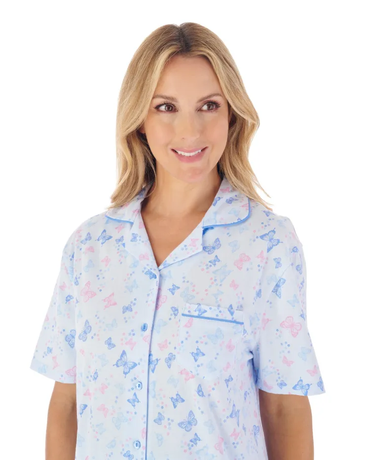 This beautiful Butterfly Printshort sleeve tailored style pyjama sat is perfect for spring. Made from breathable and comfy jersey fabric, it features a 5-button front opening, solid colour piping and a single breast pocket. Finished with an elasticated trouser waist and in a stunning allover butterfly print. You can sleep in comfort and style this spring.