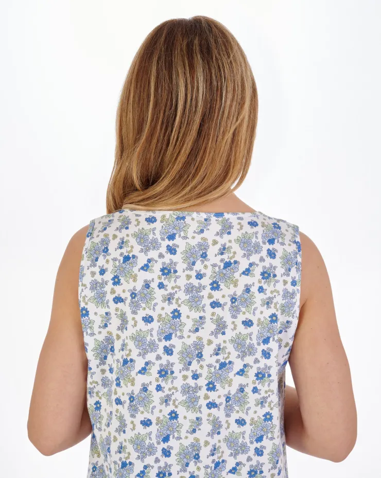 Made from 100% cotton jersey, it features a classic floral print and contrast satin piping along the round neckline. With a sleeveless design and gathers at the centre front, this nightdress provides both comfort and style.