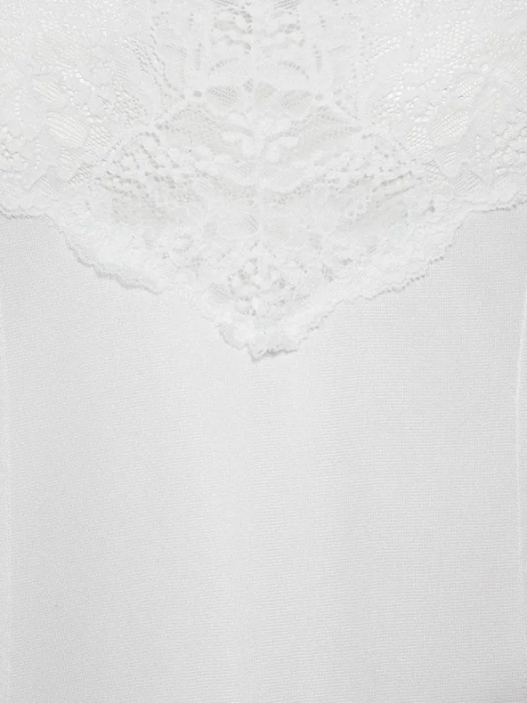 39” length opera top slip with adjustable straps for comfort and fit. Luxury lace detail to bust and delicate detail to edging.