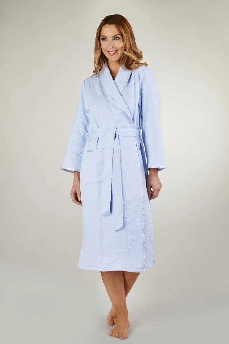A classic style housecoat designed in a mock quilt fabric ideal for comfort over our co-ordinating nightwear. Measuring 47″ in length and styled with long sleeves and a shawl wrap design this housecoat is ideal for any age. Finished with a satin binding trimapplied to shawl collar and cuffs, complete with two concealed side pockets.