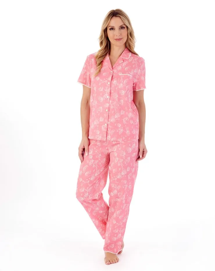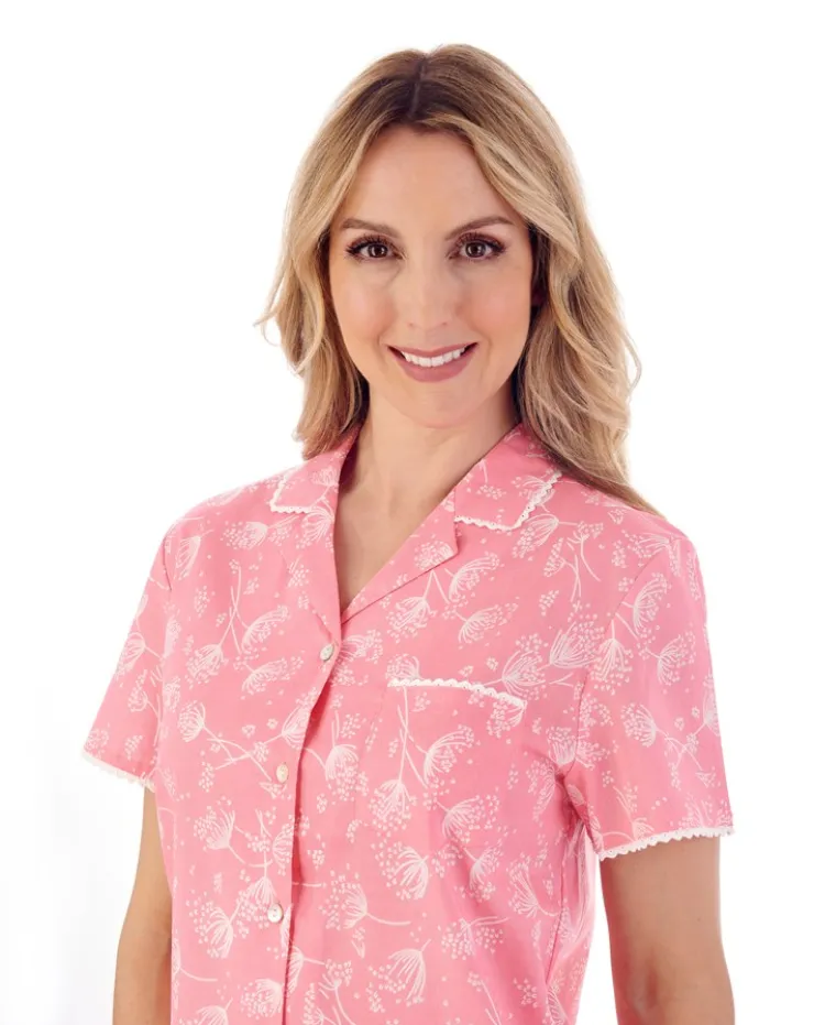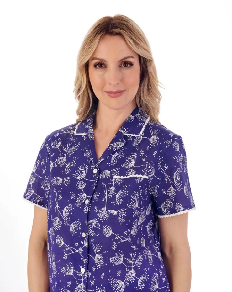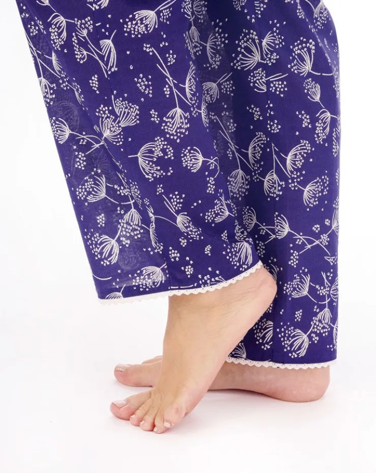 A lightweight modern tailored pyjama set that provides comfort in all sizes. With a delicate lace detail to the sleeve, trouser hem, pocket top and collar and finished with small buttons to the centre front for that added modern but classic look.