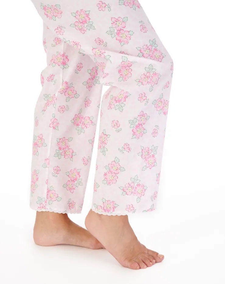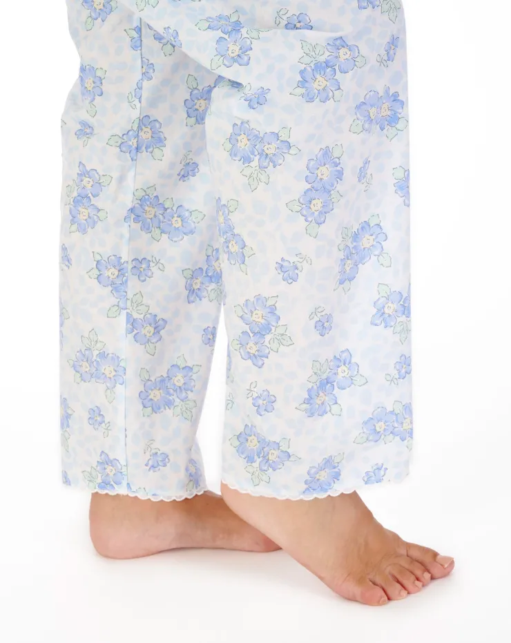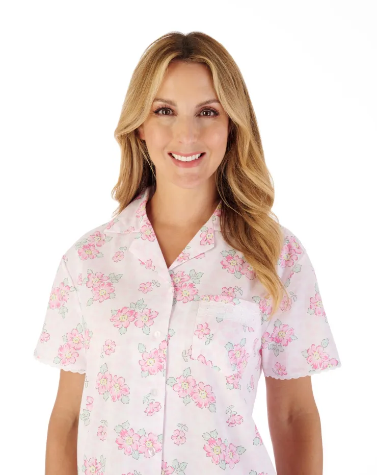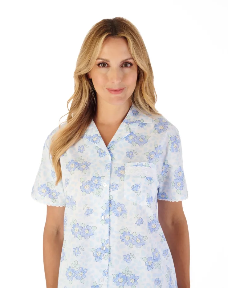 A stunning white pyjama set with a pink or blue floral design throughout, designed with a narrow broderie trim to the pocket top, sleeve and leg hem. Complete with a 5-button front opening for ease with dressing. A lovely garment for the spring and summer months.