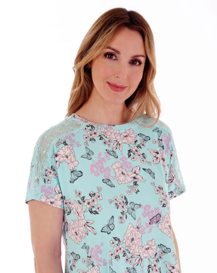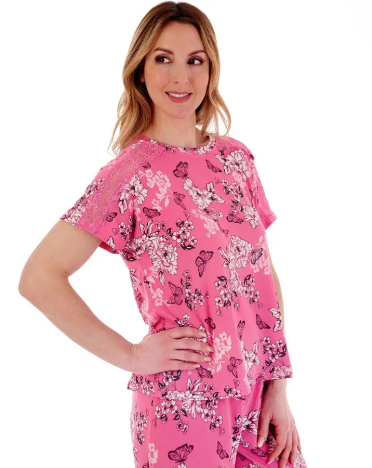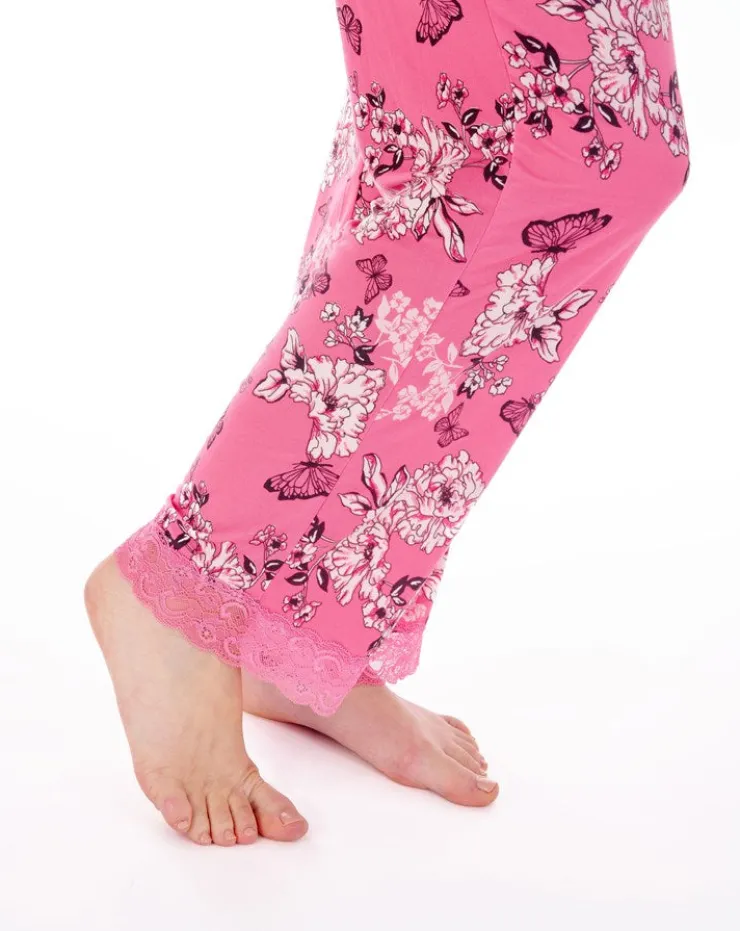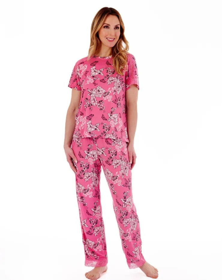 A beautiful butterfly and floral print pyjama set designed with a round neck and a cap sleeve for comfort and finished with a wide stretch lace to shoulder. The trouser are finished with the same wide lace to the hem. This super soft fabric makes them perfect for the warmer months.