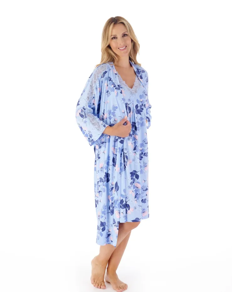 Our super-soft brushed fabric nightdress is designed in either a blue floral print throughout and a solid allover Navy. Finished with build up shoulder straps for comfort and a delicate lace trim to the V-Neck. This garment has a beautiful feel and drape to it. Complete the nightwear with a matching or contrasting kimono, see GL03704.