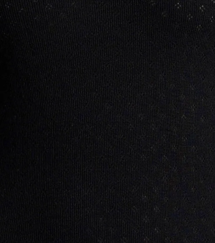 All over diamond pattern knit with lace to shoulder straps and edge with centre bow to V Neck.